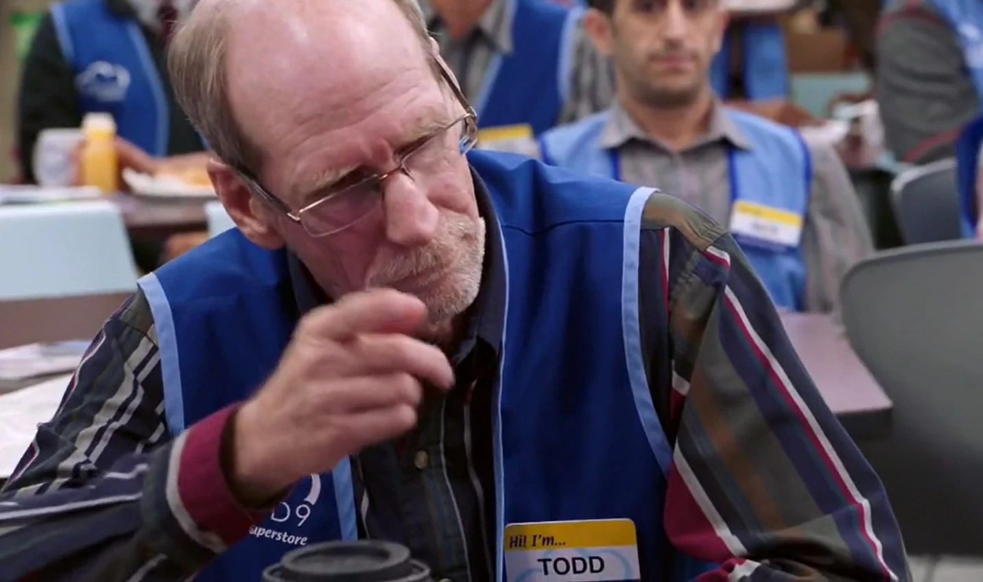 White Todd is a permanent worker. When Glenn calls a seasonal worker "Black" Todd to differentiate him from Todd and the seasonal worker shakes his head "no", "White Todd" is OK with his new moniker. On the day of the town hall, Garrett mentions Todd is 40 while Mateo says his wife is Nordic and beautiful. | |||